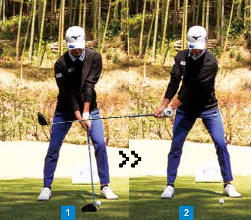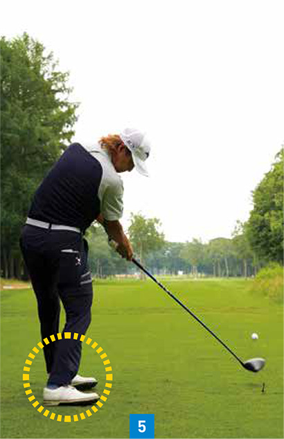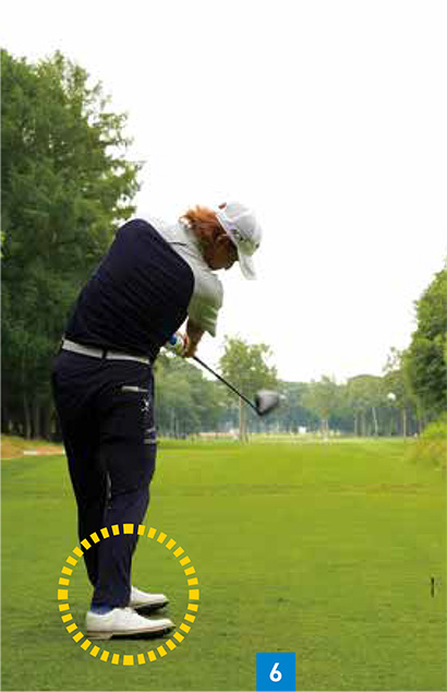 しかし、平田選手はダウンスイングでカカト側に力を入れているので、インパクト前後でもベタ足に近い(写真05、06)。ツマ先を踏んだほうが体は回しやすいので、スピードや飛距離を伸ばすには有利です。逆にカカト側に力を入れると体の動きを制限するので、前傾角度が変わりにくく、体が開いたりするミスが減ります。おそらく平田選手はジュニア時代から飛ばすことよりも曲げないことを優先していたので、カカト側を踏み込んでベタ足で打つスイングになっていったのでしょう。