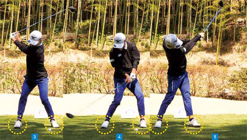 スイングの特徴としては、両足が地面についている時間がすごく長い。アドレスからフォローまで、両足をほぼベタ足にしたまま打っています(写真03。04、05)。男子ツアーの選手でここまで右足をベタ足にして地面を踏み続けている選手は珍しいです。足を強く蹴る選手だとパワーが出せる反面、軸がブレるリスクがあるが、平田選手はベタ足で打つことによって、体が伸び上がらない。その結果として、腕の通り道(ハンドパス)が安定したスイングになり、精度が高いドライバーショットが打てます。