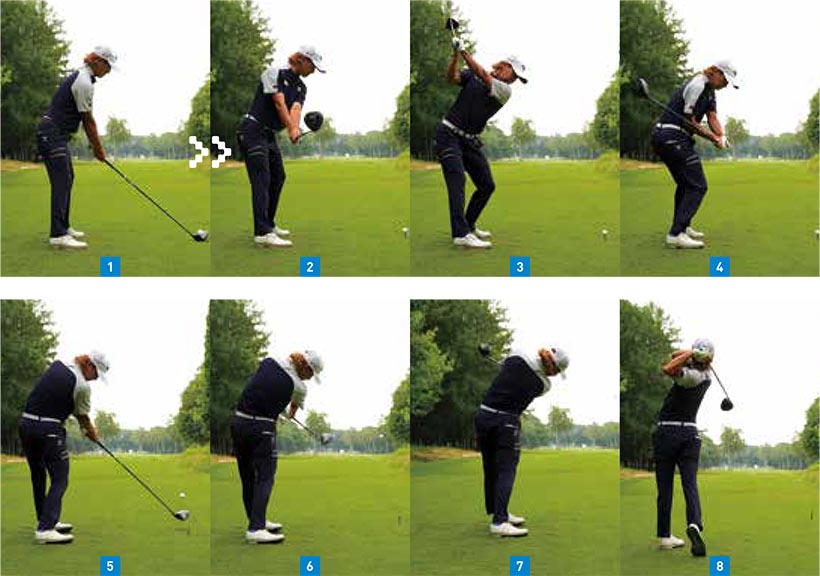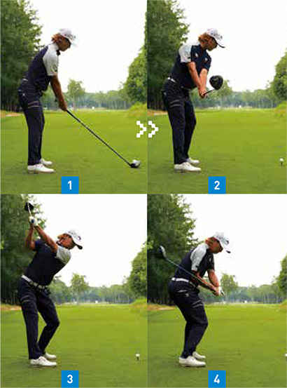 スタンス幅はやや広め。テークバックでは足の形をほとんど変えずに上半身の回転だけでクラブを上げている。