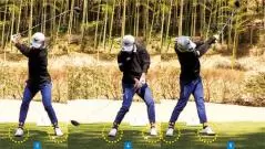 ベタ足で打てる理由は、ダウンスイングでカカト側に体重をかけているからです。一般的なスイングはダウンスイングで右足をツマ先側に踏み込むのでカカト側は浮いています。「右足を蹴る」と言われている動きです。最近では右足が完全にツマ先立ちになっていたり、米国のトッププレーヤーでは下半身をジャンプさせる選手もいます。