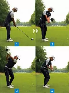 ハーフウェイダウンでは腰は目標方向を向きはじめているが、胸は目標と反対方向に向けているので上半身が開かない。