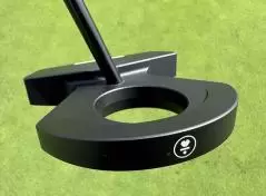 構えてみると、とにかくこの「DF3」は面白い形をしています。シャフトはフェース面よりもずいぶん後方に挿さっているし、ヘッドの後方は扇形のような形状。その真ん中に丁度ボールと同じような穴があ空いています。正直、こんな形状のパターで真っすぐ打ち出せるの? って思っちゃいます。