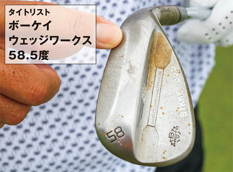 サンドウェッジのロフト角は、58度の表記ですが、実際は少し寝かせて58・5度。バウンス角は8~12度くらいが好みで、別に4~6度くらいのローバウンスのものを用意。試合のコースセッティングにより、それらを使い分けています。