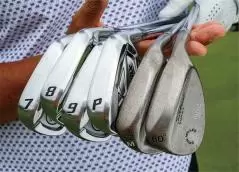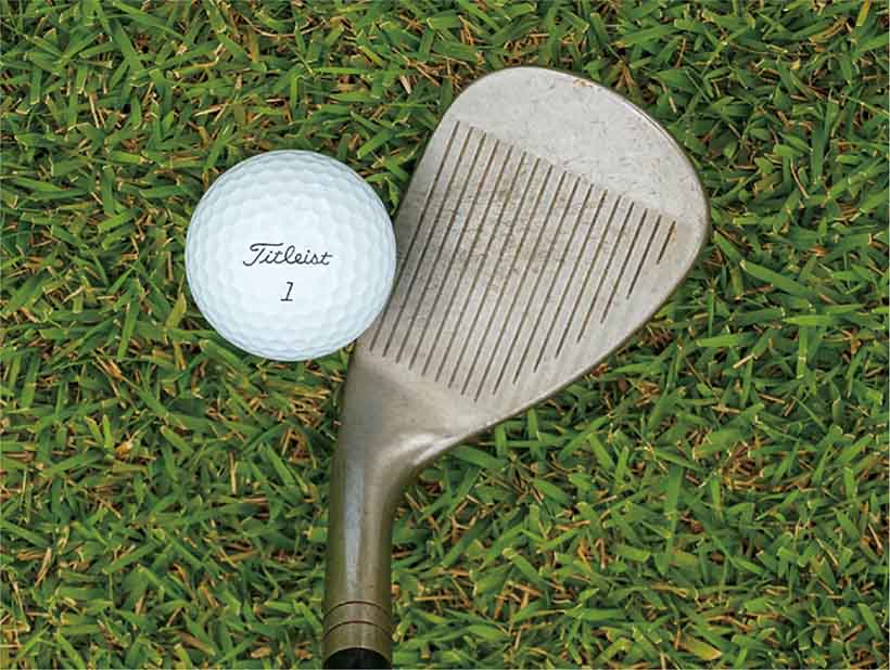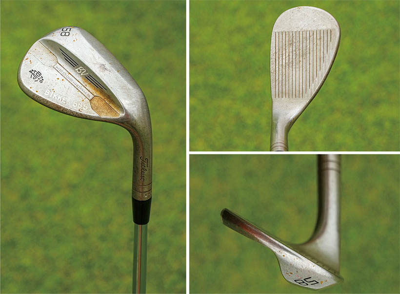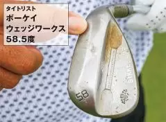 私が愛用しているのは、タイトリストのボーケイ・ウェッジで、20年以上使い続けています。フェースの形状は、角張ったものより、丸みのあるものが好み。私はウェッジを開いて使うことが多いので、その時のフェースの見え方、いわゆる「顔」が、丸みのあるほうが馴染んで構えやすいからです。