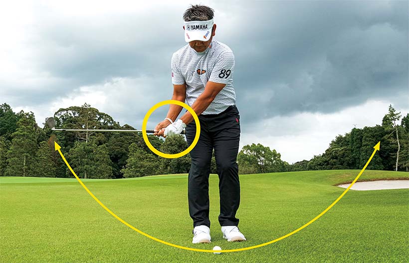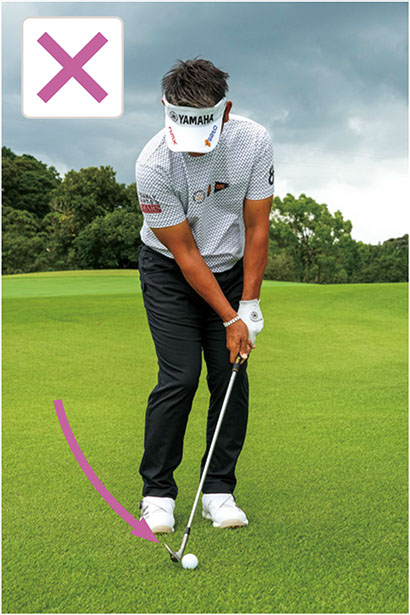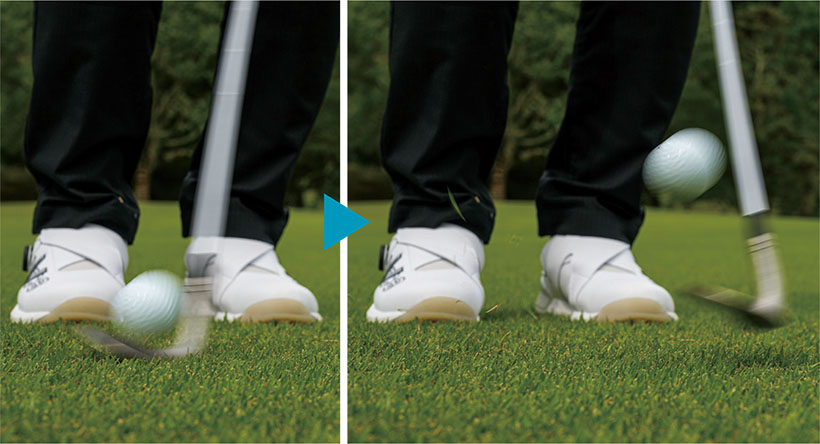 ポイントは、アドレスでボールを体の正面(スタンスの真ん中)に置き、シャフトがほぼ垂直になるように手元を中に入れて構えること。そして、手を使わずにノーコックでクラブを上げて、体の回転を使って左右対称に振ることです。こうするとクラブの入射角が緩やかになる上に、スイングの最下点がボールの先ではなく真下になるため、バウンスの跳ね返りが少なくなるのです。