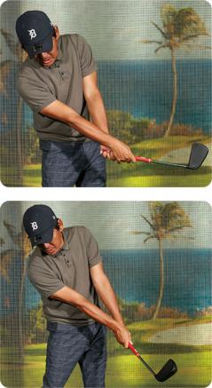 フォワードプレスの段階で、コッキングの動きを入れると左ワキが緩み、フェースが開きやすくなる。左手甲の向きは変えず、腕とクラブを一体にして押し込むのが正解。