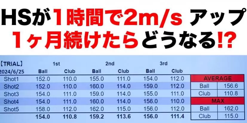 トレーニングの回数を重ねると、前回と同じ感覚で振ってもクラブスピードが微増するようになります。僕は今、初めてやった時からヘッドスピードにして、さらに2m/sくらい上がっているんですが、これってなかなかの数字。何よりクラブスピードが速くなっただけでなく、ボールスピードもしっかり上がっているんです。速く振れるだけじゃなく、芯を食って飛ぶ球にもなっている。それまでは頑張って270~290ヤードだったのが、トレーニングしたあとには300ヤードを超えました。