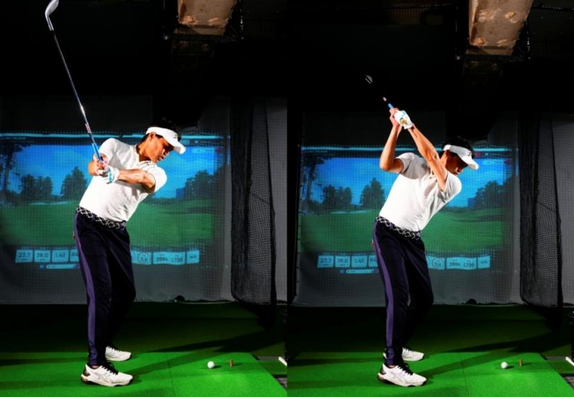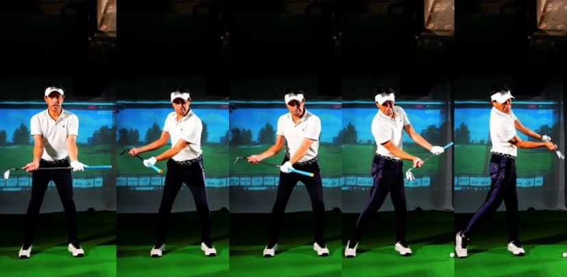 「上半身の動きを見るとハーフだけど下半身の動きを見るとフルスイングなんです。悪い例としてはアマチュアの方はハーフスイングといって形だけ半分にするので、手だけハーフスイングする」(内海プロ)