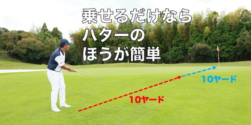パターを使う場合、気になるのは距離。花道からだとグリーンに届く前に芝に食われて急激に球足が鈍るため、みなさん長い距離は打てないと考えます。おそらくグリーンまで10ヤード程度距離があり、そこからピンまで10ヤードの計20ヤードだったらパターを使う人はいないでしょう。