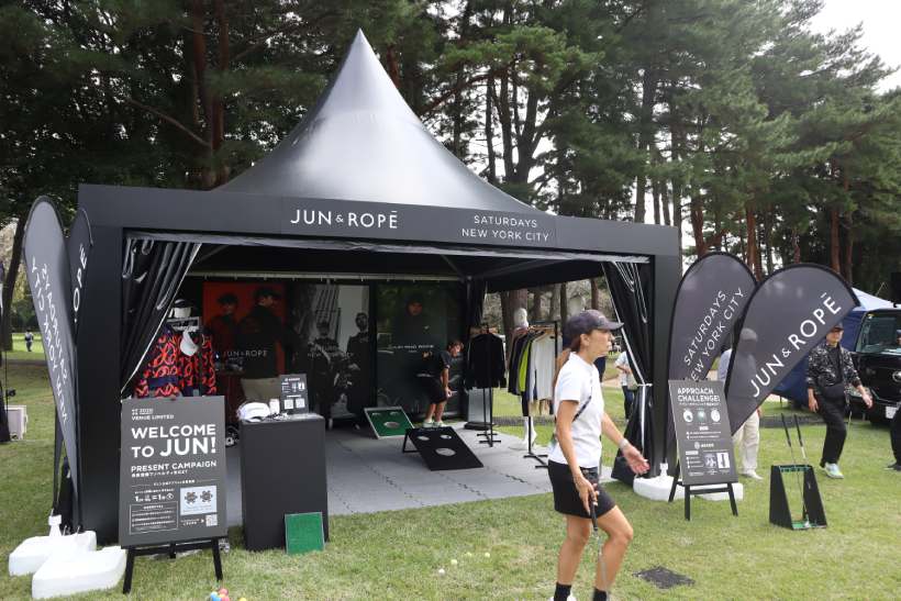 こちらの「JUN & ROPE」と「SATURDAYS NEW YORK CITY」のブースでは、アプローチチャレンジを実施。JUN GROUPに会員登録をして挑戦可能。5球あるうちの3個入れたら、キャップ、2個入れたらボール、1個入れたらツアーティがもらえるという豪華なもの。
