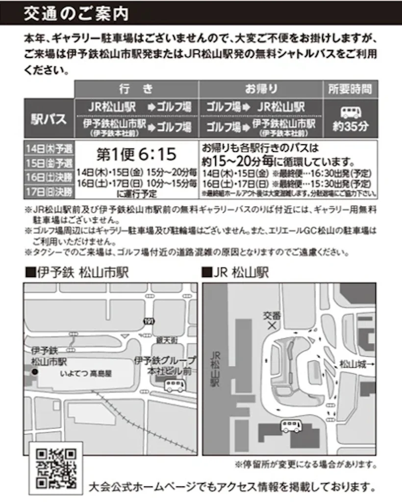 ギャラリー駐車場のご用意は中止とさせていただきます。 大変ご不便をおかけしますが、ご来場の際はいよてつ松山市駅およびJR松山駅発の無料シャトルバスをご利用ください。(所要時間約35分)