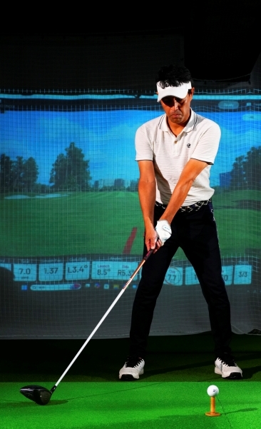 「ドライバーの軌道のイメージ。イメージはパスで言ったらアッパーブロー。範囲で言ってもせいぜい0度からアッパーです。アマチュアの方ならダウンブローはナシ!」