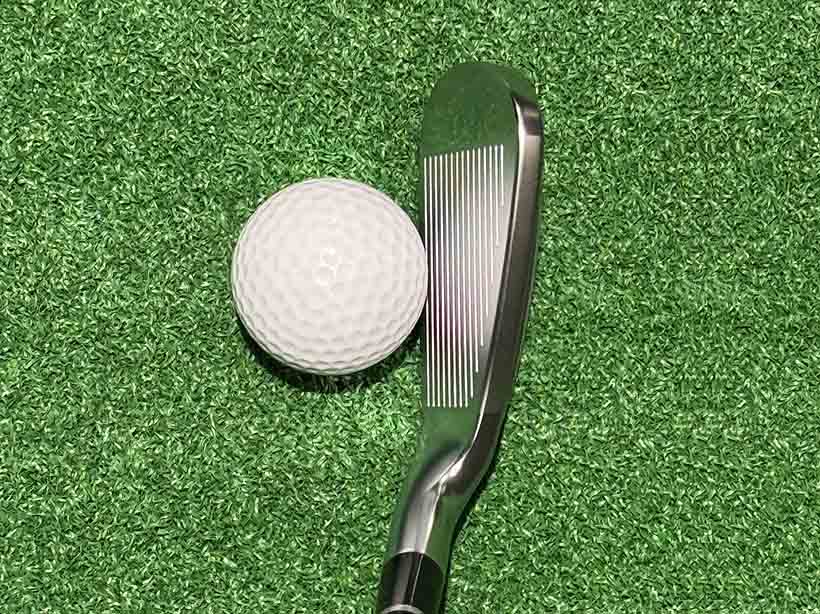 構えてみると、トップブレードは適度な厚みで、トウからネック側にかけて丸みをおび、ボールを包み込むような優しさを感じます。ヘッドは少し大きめ、グースも少なめで、飛び系ながらとても構えやすい。もっさりとした感じがなく、意外とシャープさも感じます。