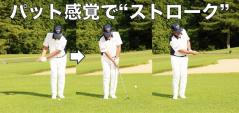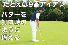 打ち方はパターと同じ。ただ、同じように打つには通常のショットよりボールの近くに立ち、パターのようにクラブを吊るスタイルで構える必要があるので、クラブは短く持ちます。このアドレスに伴い、ヒールが浮く格好になりますがそれでOK。ダフりづらいし、ヘッドの抜けもよくなります。