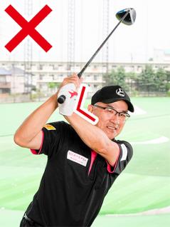 飛ばないトップの例として、体重が左足に多く乗って上体が目標側に傾いてしまう、手上げになって両手が低い位置におさまってしまう、などがあります。