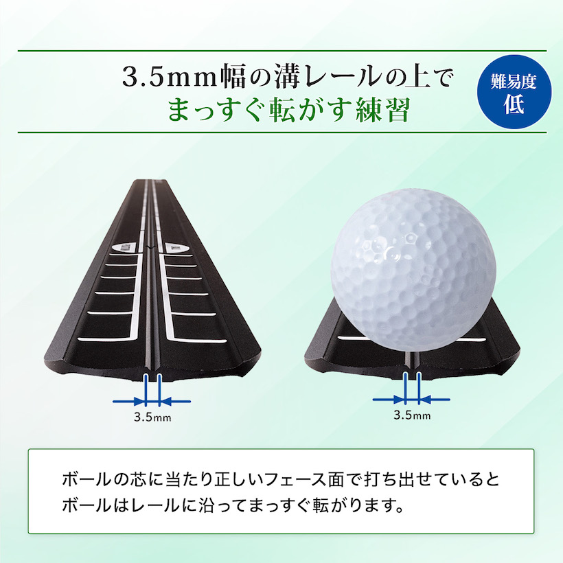 『パットチェッカーロング』は両面が難易度の異なる形状になっている。3.5mm幅の溝がある面は、ボールをセットする位置から、溝レールに合わせてまっすぐボールが転がせるようにストロークする。溝レールがガイドになっているので、ボールの芯に当たり正しいフェース面で打ち出せているとボールはレールに沿ってまっすぐ転がる。