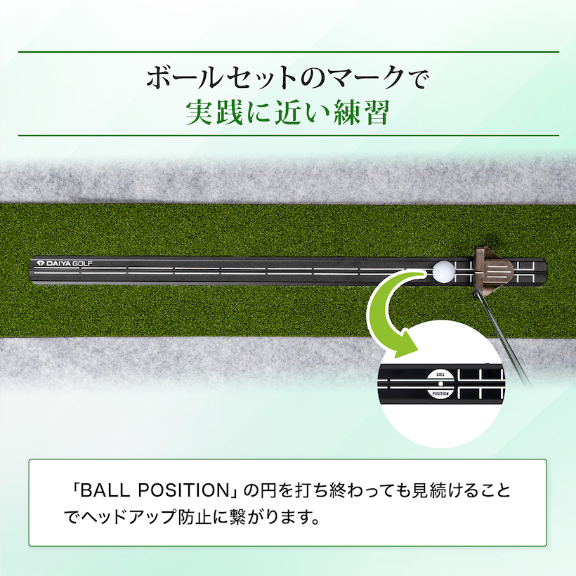 本体のボールセット位置にある「BALL POSITION」の円を打ち終わっても見続けることでヘッドアップ防止に繋がる。また、ボールセット位置からテークバック側にはスクエアに打ち出すための「垂直ライン」とまっすぐ引くことを意識する「水平ライン」の2種類のガイドラインがついている。約3cm間隔で引いてある「垂直ライン」に合わせてテークバックすることで、振り幅と距離感も身に付けることができる。