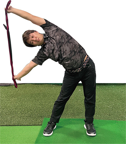 「側屈で注意してほしいのは、側屈しているつもりでも腰が動いてどこもストレッチされていない状態になることです。それを避けるには腰を先に出してしまう。そして横に倒れれば胸椎の側屈になります」(宮澤氏)