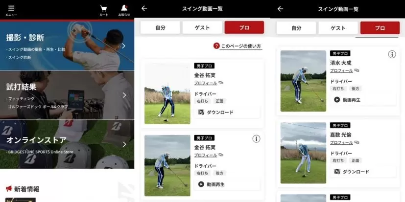 まずはホーム画面一番上の「撮影・診断」をタップ。画面が変わったら「スイング動画一覧」をタップ。右上の「プロ」をタップすると新たに加わった金谷拓実、佐藤心結、清水大成プロの動画が出てくる。そしたらダウンロードをタップして、まずはアプリ内にプロの動画を保存する。正面と後方、両方ともダウンロードしておこう。