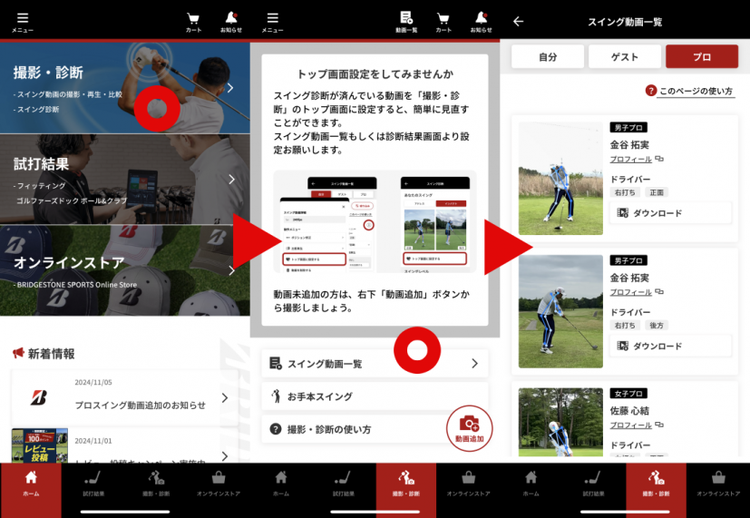 まずはホーム画面一番上の「撮影・診断」をタップ。画面が変わったら「スイング動画一覧」をタップ。右上の「プロ」をタップすると新たに加わった金谷拓実、佐藤心結、清水大成プロの動画が出てくる。そしたらダウンロードをタップして、まずはアプリ内にプロの動画を保存する。正面と後方、両方ともダウンロードしておこう。