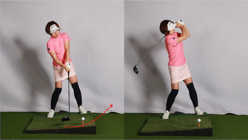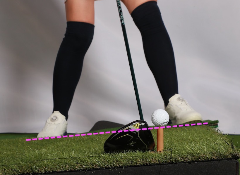 わずかな左足上がりでも体重は無意識に右足にかかります。スイングがアッパー軌道になるドライバーではなおさら。つまり、右足の高さの感覚で打つ感じになるため、ヘッドがボールの下を潜ってテンプラになりやすいのです。