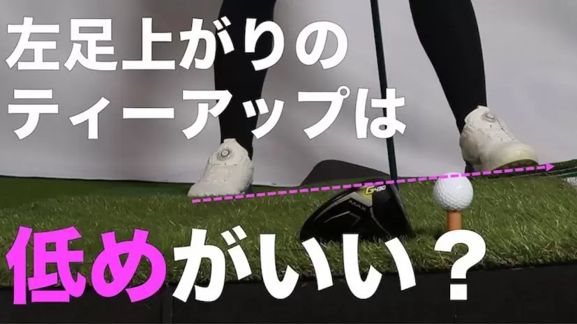 ということで、対策は右足を基準にティアップすること。左足上がりだなと感じたら、いつもより低くティアップしましょう。どれくらい低くするかといえば、右足の高さから見た時にティアップが高すぎなければOKです。ティーイングエリアでは、あからさまな左足上がりはほぼありませんから、低めにすると言ってもせいぜい1センチ程度でいいと思います。