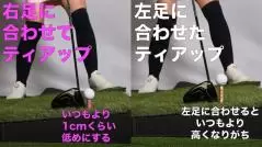 左足上がりで左カカト延長線上にいつもと同じ高さでティアップすると、左足側の地面とボールとの高低差はいつもと変わりませんが、右足との高低差はそれより大きくなります。仮に左足が2センチ高くなっていたら、右足から見ればいつもより2センチ高くティアップしたことになるわけです。