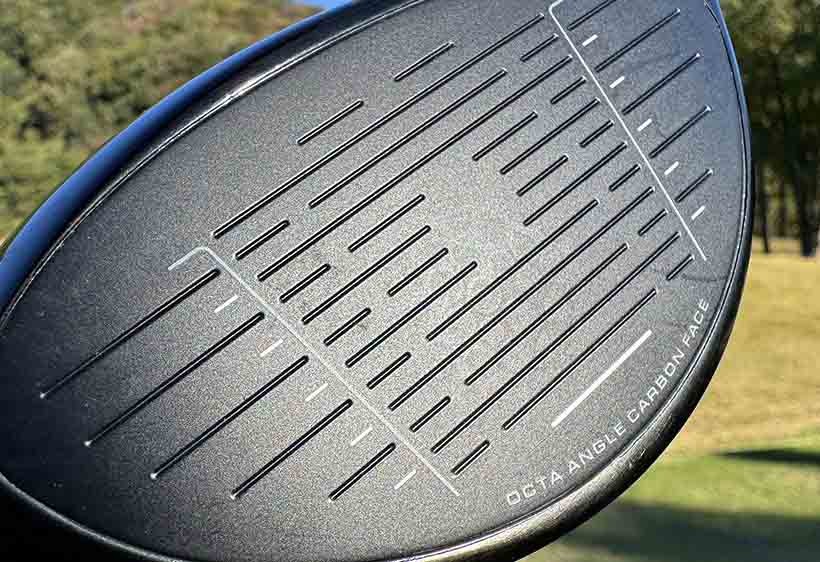 まずこのクラブの一番の特徴としてはカーボンフェースです。三菱ケミカルと共同開発した「8軸カーボンフェース」が採用されているんです。8軸というのは、縦方向と横方向、斜め45度方向のカーボンを編み込んだ6軸に加え、22.5度方向のカーボン繊維を編み込んだのが8軸カーボンということになります。このことでさらに広範囲における強度が向上し、フェースのどこに当たっても高初速を可能にできたんですね。
