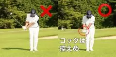 「手首を使う=コック」と考える方が多いと思いますが、コックを使うとシャットフェースになりやすいので手首をタテに折る動きは控えめ。バックスイングでは左手の甲が正面に向くように手首を使います。