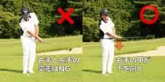 また、コックが強いとフォローサイドで手首が入れ替わり、右手の甲が正面を向く格好になってフェースが返りすぎてしまいます。そうではなく、右手の甲が下を向くように使うのが安全な手首の使い方。フェースが過度に閉じないのでスピンがかかりすぎないのです。