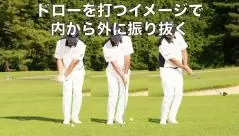 アドレス時のボール位置は真ん中。ショルダーワークの時と同様、ハンドファーストにするならわずかに止めましょう。ドローを打つイメージなので、インサイドからアウトサイドに振り抜く感じで打つと上手く手首を使えると思います。