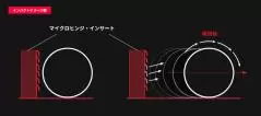 L字を右に90度倒した突起を、適度な隙間を開けて並べて、右サイドを固定し、樹脂で隙間を埋めたフェースで、左にあるボールを打つことを想像して欲しい。突起の下側が空いているので、少しだけ下側に突起が折れて、戻る動きをする。これが「マイクロヒンジ・インサート」の構造と仕組みで、順回転に早くから転がるボールが打てるというのがセールスポイントだった。