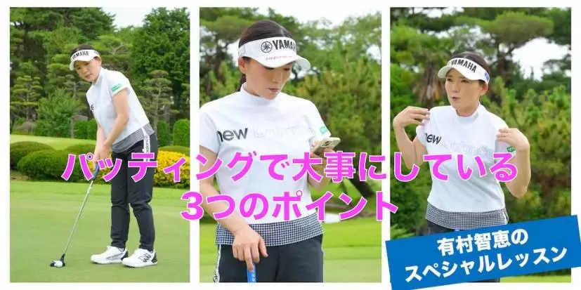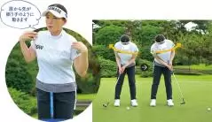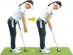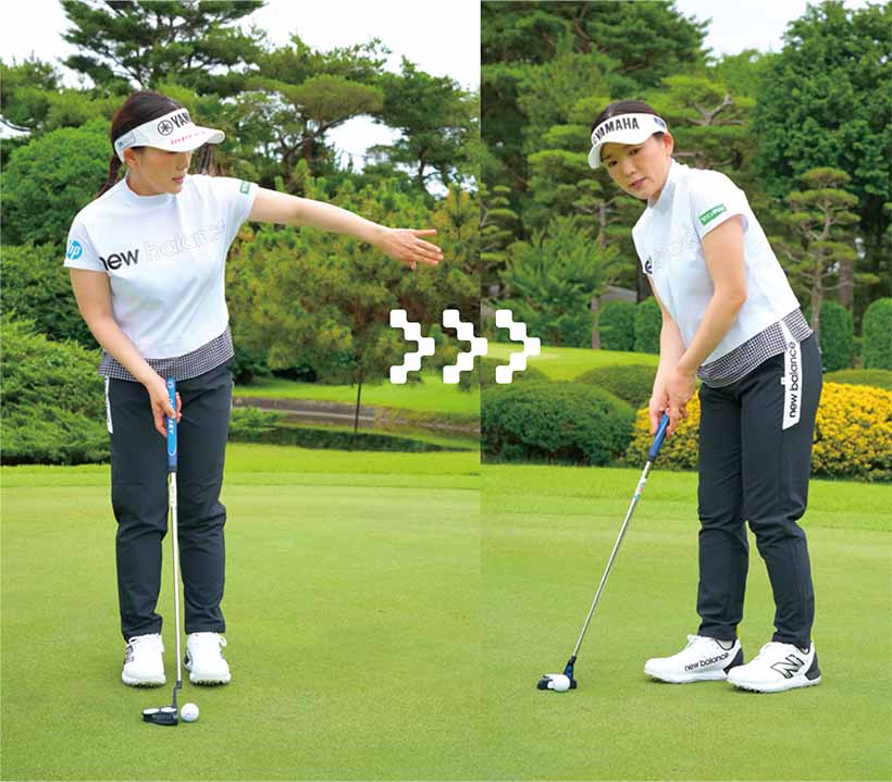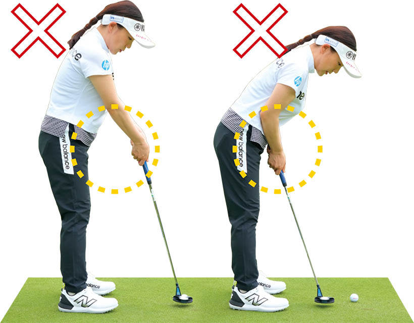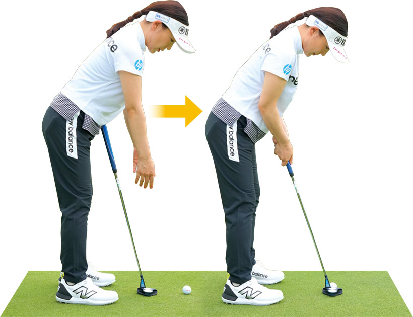 いつも一定の軌道で打つことがパットを安定させるコツ。アドレスで手が体から離れたり、近づきすぎると軌道がゆがむので、肩の真下に手を下ろし、そこでグリップするように。この位置が決まるとボールの位置も自ずと決まる。