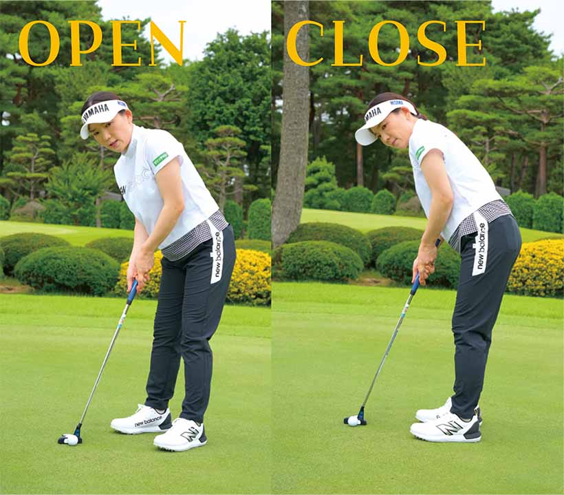 パットの場合、ラインに対してかっちりスクエアにアドレスする人も多いですが、私はフィーリング重視なのでかっちり決めず、ラインに対してどう構えたら手が気持ちよく動くかを考えて構えます。ですから、ラインによってオープンに構えることもあればクローズに構えることもある。例えばスライスラインならオープンに立って右、フックラインならクローズに立って左に打ち出すこともあります。
