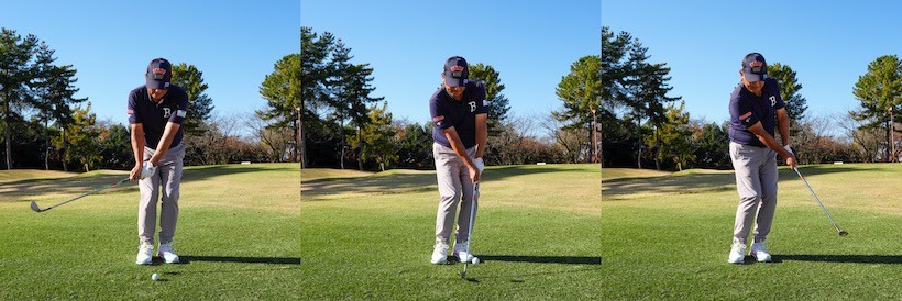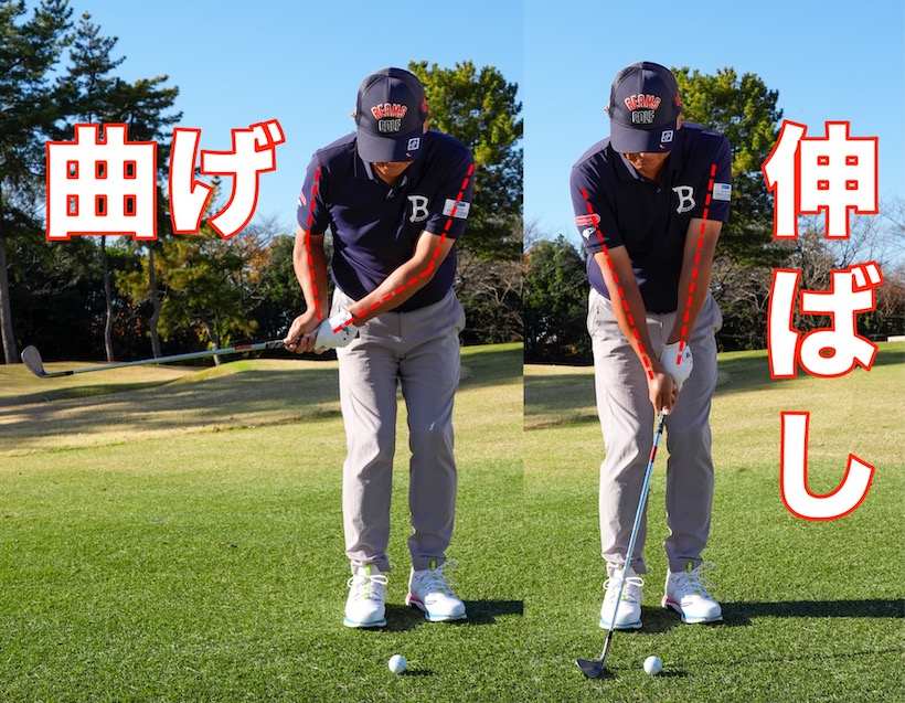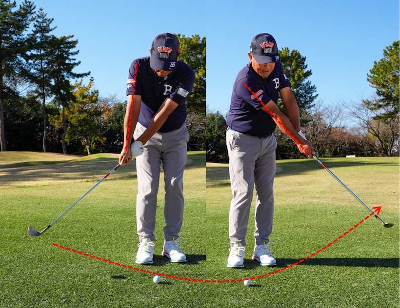 右手で打つ意識があると、当然ながら利き手である右手を使って打とうとします。そのぶん右手は動きます。例えばテークバックからインパクトで、右腕を曲げ伸ばして打つ。こうなるとヘッドが上下に動いてダフりやすくなります。ショットもアプローチも、そもそも打つ瞬間に腕が伸びるのはNG。伸びるのは打ってからです。