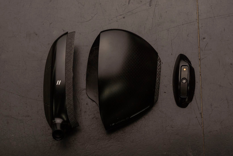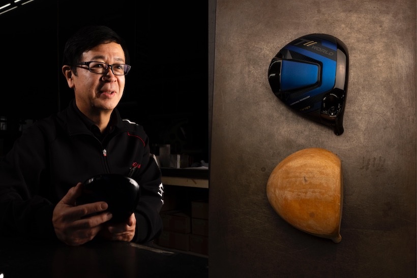 「フェース側とテール側を除くヘッドの中心部はカーボンをロール状にしたパーツを使用しています。インパクト時に生じる応力を最大限に利用する目的でフレームをなくしました。設計から製品化までに5年の歳月を費やしてカーボンパーツの強度を最適化。余剰重量を有効利用して慣性モーメントの最大化を図っています」(佐藤)