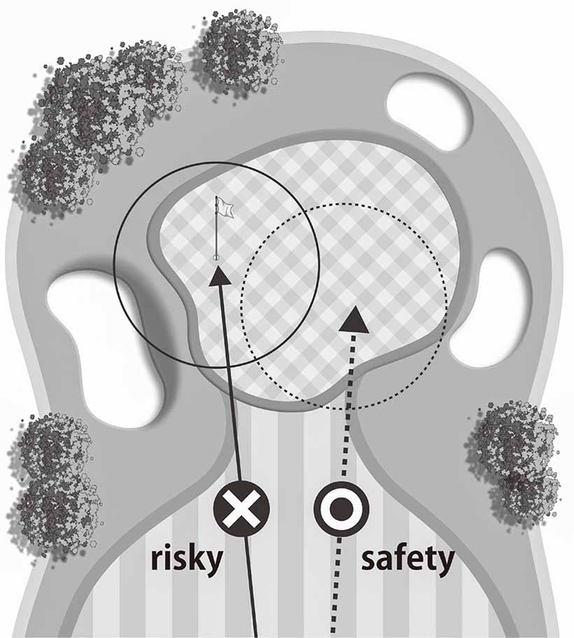 いいスコアを出すにはピンを狙ってナイスショットを多く打たないといけないと考えているとしたら、その思考は捨てましょう。ピンの位置よりも、まずグリーン周りの状況をよく確認する。ピンに直接打つとどんなリスクがあるのか。自分のミスの傾向やクセからどんな結果が予測できるか。それらをトータルで考えると、ミスしても安全なエリアが見えてきます。