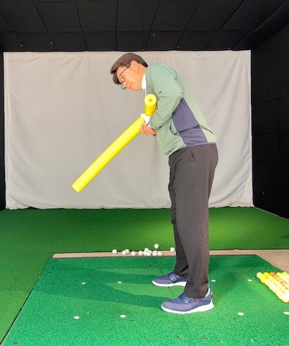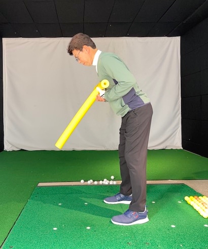 ⚪︎前傾角度を維持するためには、スイングの始まりから終わりまで、カラダの安定を図る必要があります。土踏まずあたりで体重を受け止めたままスイングする意識があると、バランスを保った状態で打つことができます。