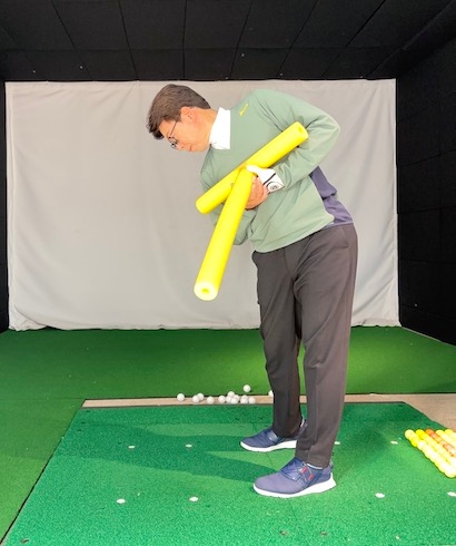 ⚪︎前傾角度を維持するためには、正しいアドレスが大切です。持つクラブにもよりますが、足は肩幅程度に広げ、ヒザを軽く曲げます。上半身を腰から曲げて前傾し、背中を丸めずに、真っすぐにします。手が肩の真下に来るように、腕を自然に下ろして、クラブを握りましょう。腰を曲げるときは骨盤が前傾するようにします。