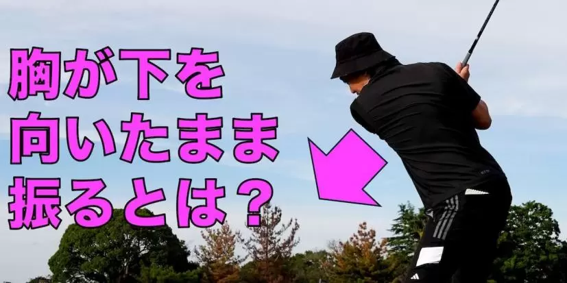 前傾角度を維持してスイングするためには、下の写真のように、アドレスしたときの胸の向きを変えない意識をもちましょう。せめてフォローまでは、胸が“下を向いている”状態を保つように気をつけるのがおすすめです。