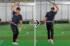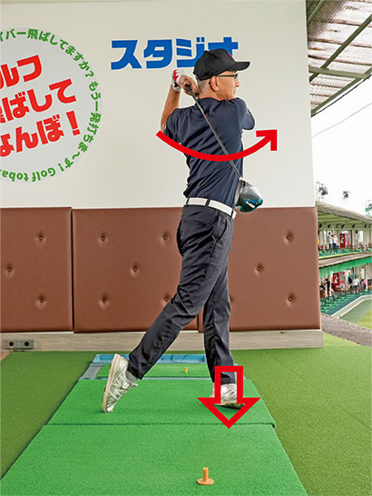 そしてダウンスイング以降は左股関節を軸として体重を左足に乗せていき、フィニッシュへとカラダをフル回転しましょう。