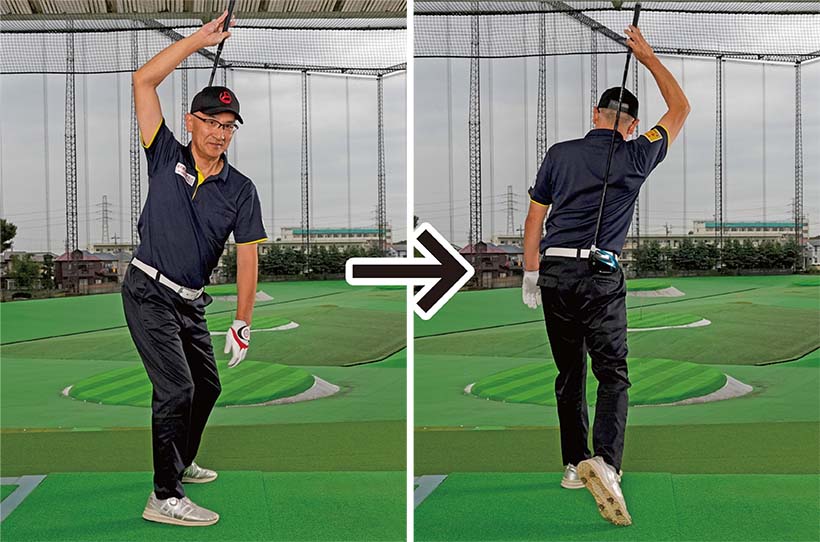 右股関節を軸にして右足に体重を乗せていけばカラダの捻転が深くなり、飛ばしのパワーが十分にたくわえられます。