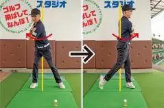 バックスイングで上体が右に流れると、その反動でダウンスイング以降では上体が左に流れてしまいます。元に戻そうとするアジャストの動きが生じ、カラダの回転軸が左右に大きくブレて様々なミスショットを引き起こします。