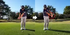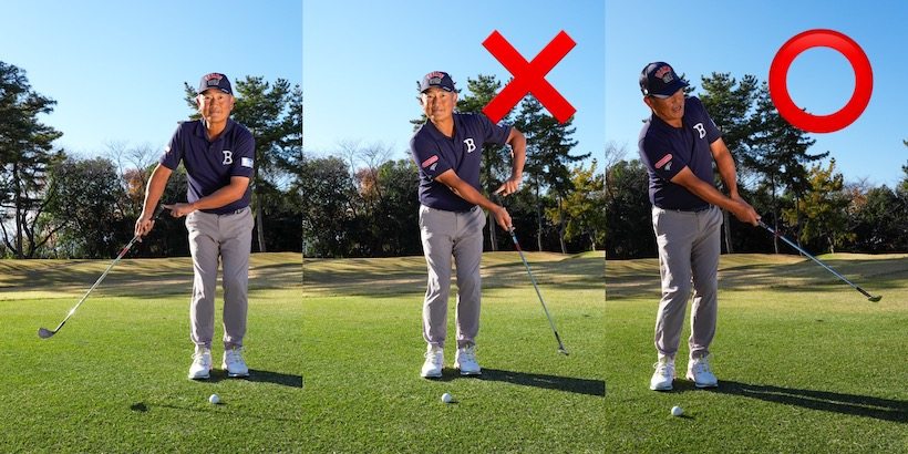 ということで、手元をスライドさせなければトップしません。対策としてはグリップエンドを意識してみる。スライドするということはテークバックやフォローでグリップエンドが体の幅からハミ出して平行移動する格好になっていますから、常にグリップエンドが体の中心を向くように、体の回転でストロークするのです。