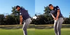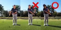 イメージドリルとしては、下の写真のようにクラブの上半分が体の左サイドに当たるくらい短く持ちます。この構えからアプローチするイメージで「右→左」と体をターンさせます。インパクトからフォローでクラブが体の左サイドから離れてしまうのがトップする形。インパクトからフォローで、クラブが体の左サイドに着いたまま動ければOKで、この動きをアプローチに反映させればトップしません。