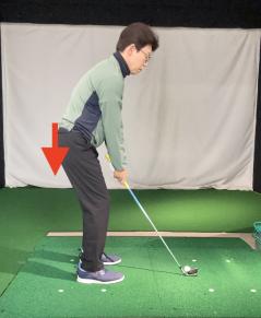 椅子に腰掛けるようにお尻の下がったアドレスをする人もわりと多いです。お尻が下がると骨盤が後傾し、カカト側にたくさんの体重がかかってしまいます。こうなるとウェイトシフトなどを行う際、下肢がスムーズに動きにくくなります。また、腰の回転にも悪影響が。股関節から上半身を折り曲げて、お尻を後ろへ少し突き出すようにすると骨盤が前傾し、下肢も腰も動かしやすくなります。