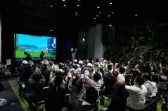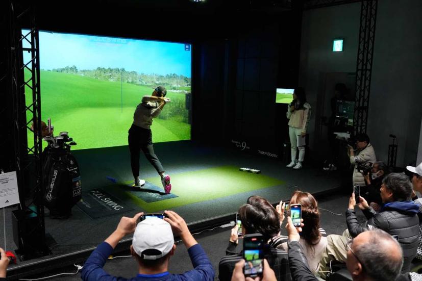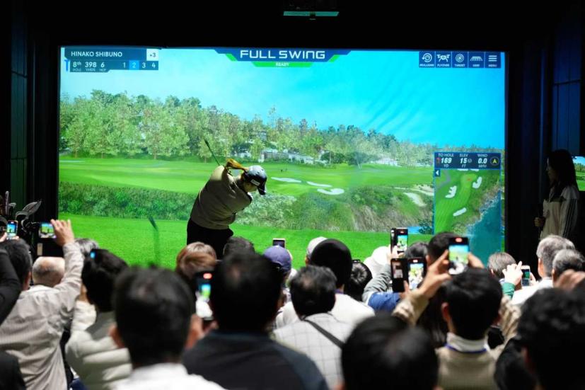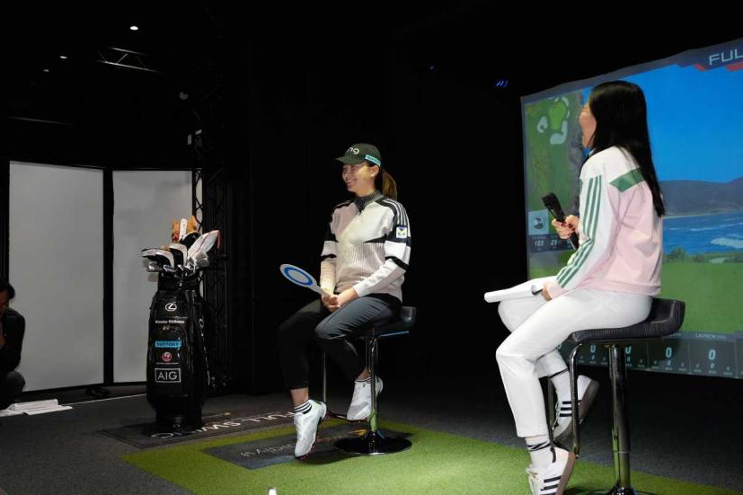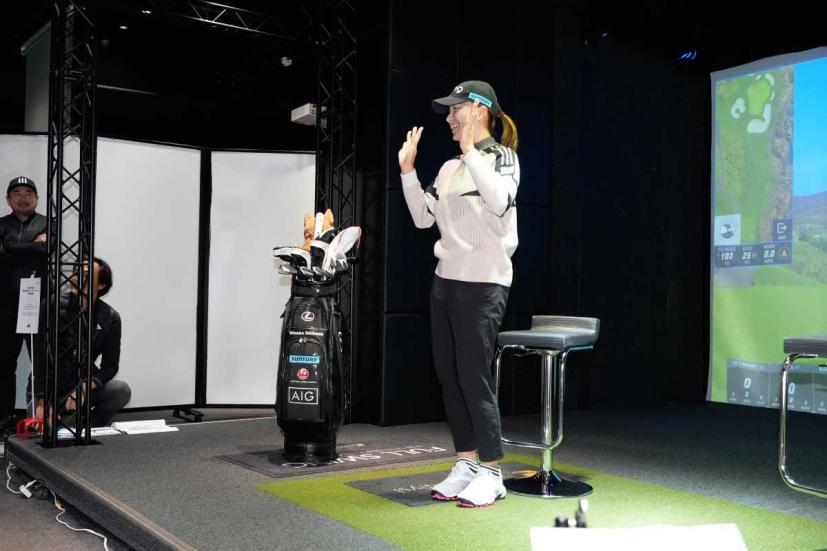 トークショーの後は、アンバサダーを務めるゴルフ弾道計測器「フルスイング」で3ホールのラウンドを披露。しかも撮影OKということで、会場がカメラでいっぱいになった。