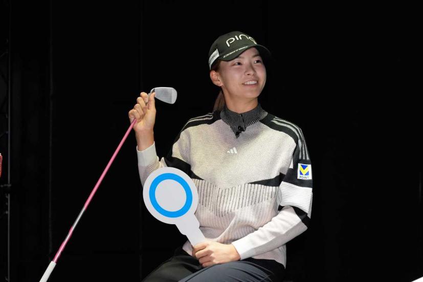 まず初めに行われた○×クイズコーナーでは、渋野プロのリアルな回答に会場は大興奮。ラウンド前のルーティンに関して、ショットからパターまでしっかりウォーミングアップをするので、「試合前に疲れていることもあります(笑)」と笑いを誘っていた。
