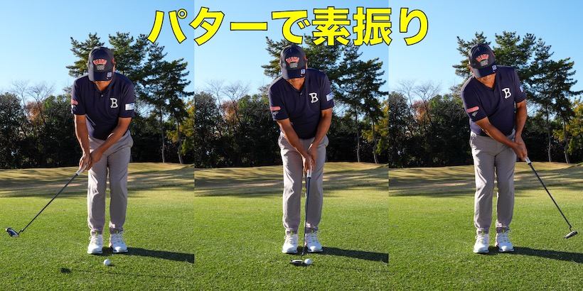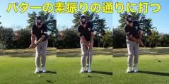 これらを防ぐには、前回同様グリップエンド体に向けたままストロークするのが効きますが、もっといいのは打つ前にパターで素振りをすることです。アプローチに臨む際にはパターを準備していることが多いはず。それなら武器として使わない手はありません。パターでダフるのは相当なミスで、ほとんどの人はダフりませんから、それと同じように振ればいい。パターの素振りで距離感を出すこともできますし、次のパッティングにも役立つので一石二鳥です。