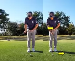 前回もお話ししましたが、アプローチではグリップエンドが体の幅からハミ出さないようにストロークする、すなわち体の前にあり続けるのが理想です。トップではグリップエンドが右から左へとスライドしますが、ダフりの場合は、ヘッドと逆方向に動くためボールの手前に落ちやすくなるのです。一方の腰由来は、左腰が引けると自動的に左ヒザが伸びて右ヒザが曲がり、そのあおりで右肩が下がる。そのせいでダフるわけです。
